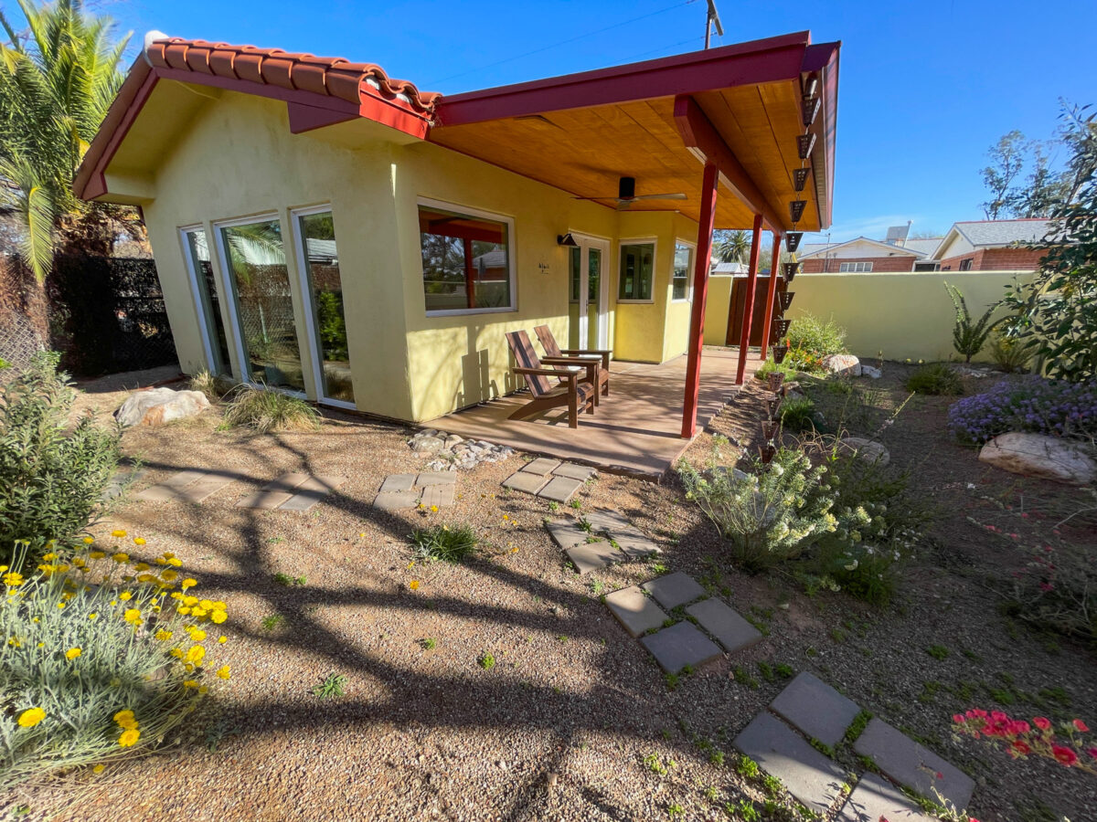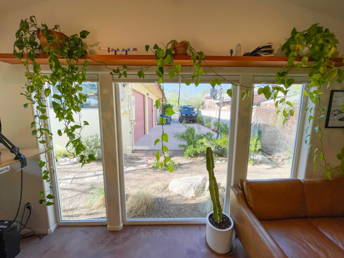 Today, I walk 20 seconds from my house to my custom-built backyard office. Windows frame the mountains and skyline. A rain chain trickles into a desert garden where hummingbirds visit flowering native plants. The space is flooded with natural light, and my kids occasionally wave as they play outside.