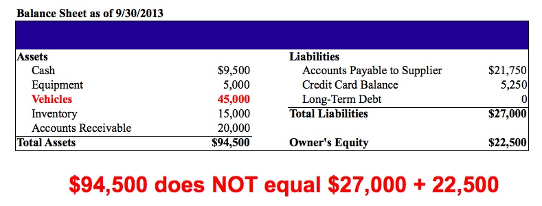 Let’s tackle the asset side of the accounting balance sheet first. Because the car is valued at $45,000, we’ll add this amount to the assets side under the account “Vehicles”. But this leaves our balance sheet unbalanced as you can see below: